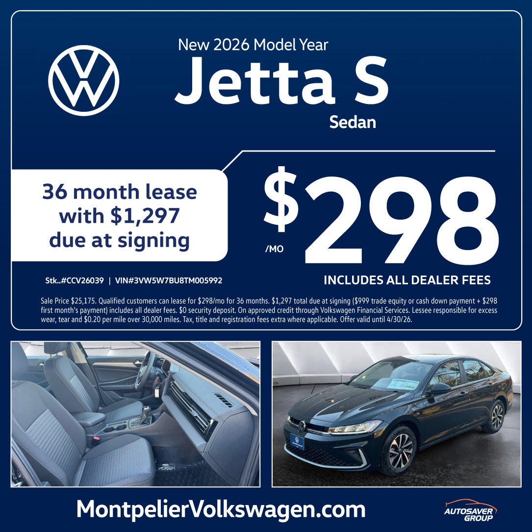 Sale Price $25,175. Qualified customers can lease for $298/mo for 36 months. $1,297 total due at signing ($999 trade equity or cash down payment + $298 first month's payment) includes all dealer fees. $0 security deposit. On approved credit through Volkswagen Financial Services. Lessee responsible for excess wear, tear and $0.20 per mile over 30,000 miles. Tax, title and registration fees extra where applicable. Offer valid until 4/30/26.