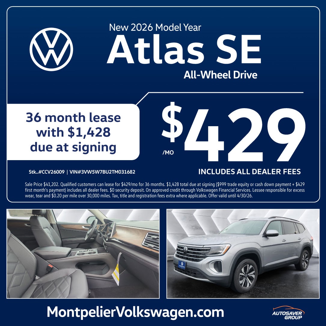 Sale Price $32,979. Qualified customers can lease for $349/mo for 36 months. $1,348 total due at signing ($999 trade equity or cash down payment + $349 first month's payment) includes all dealer fees. $0 security deposit. On approved credit through Volkswagen Financial Services. Lessee responsible for excess wear, tear and $0.20 per mile over 22,500 miles. Tax, title and registration fees extra where applicable. Offer valid until 4/30/26.